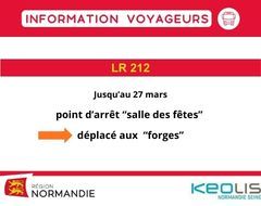 Le point d'arrêt "salle des fêtes" de la ligne 212 est temporairement reporté "aux forges" jusqu'au 27 mars (cause travaux)
