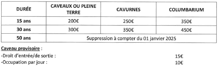 Tarifs pour les concessions au cimetière et au colombarium (La Loi finance 2021 supprime les taxes funéraires) :
